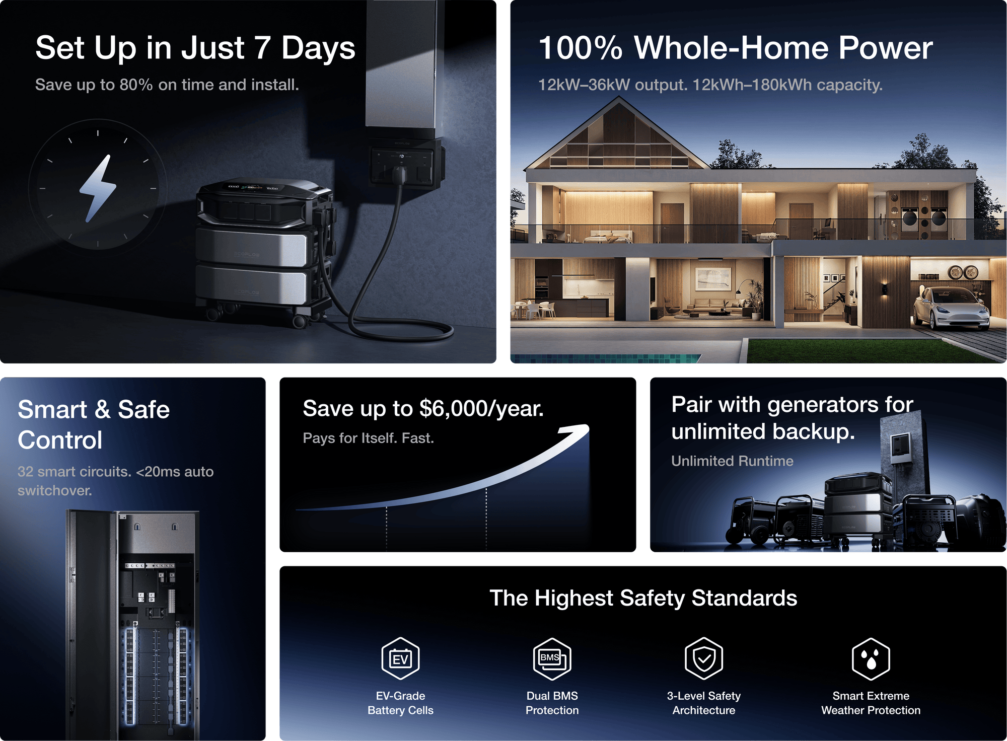 DELTA Pro Ultra X scales from 12 to 36kW. With a new Adaptive Start algorithm, it intelligently identifies connected appliances and tailors startup for each, seamlessly handling surges up to 45kW and high-demand appliances like a 5-ton AC.